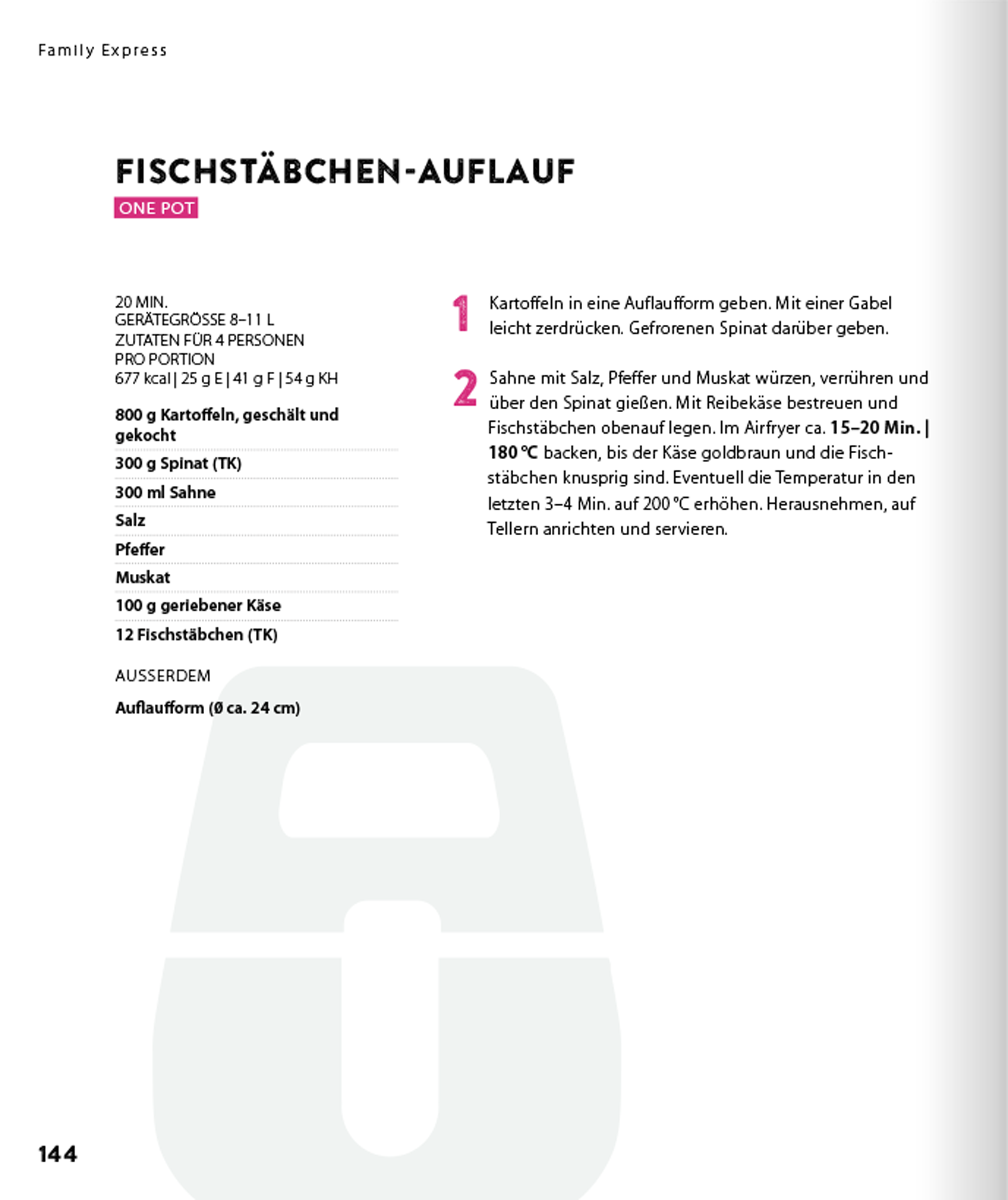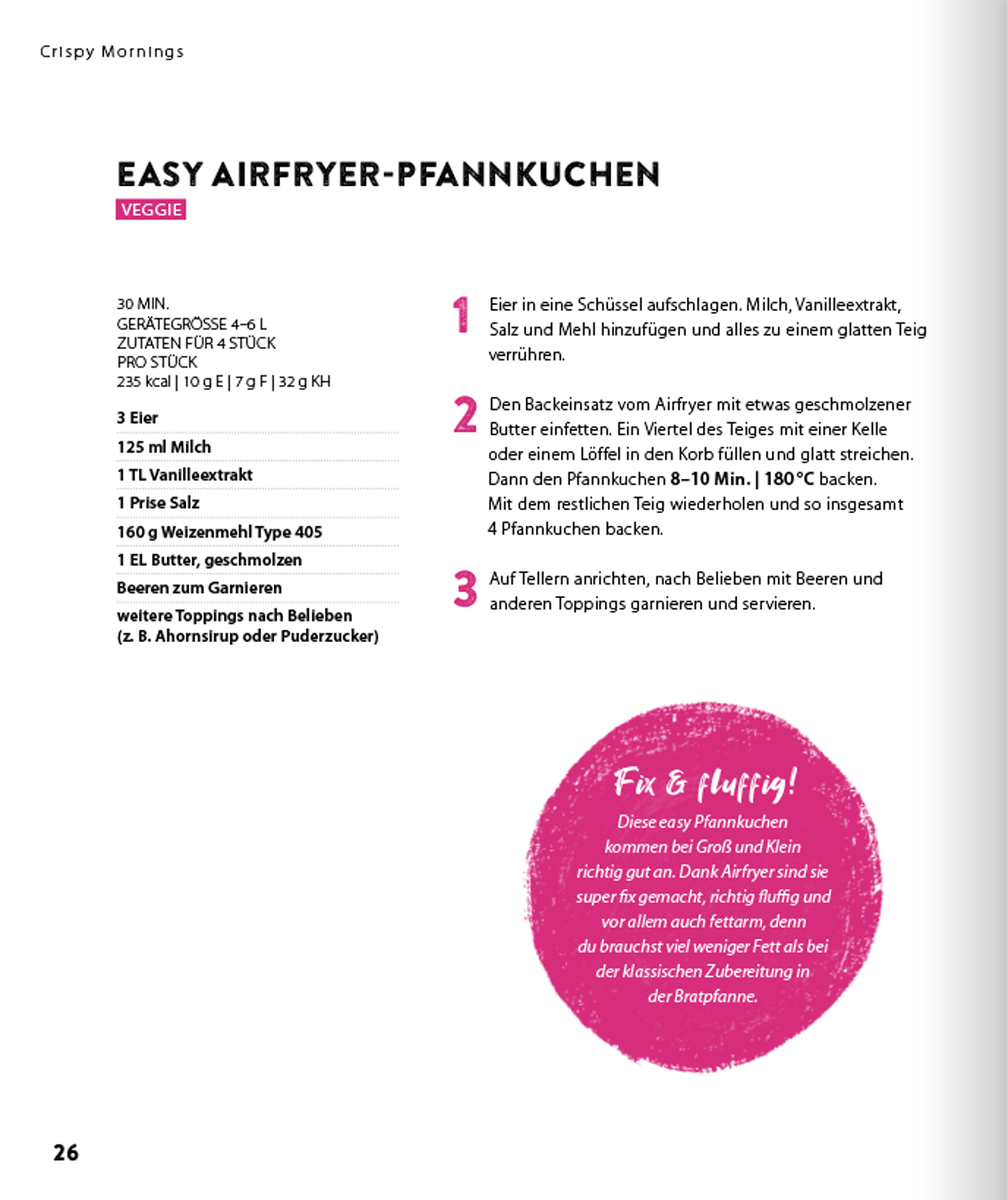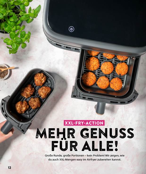 Hier kommt alles auf den Tisch, was die ganze Familie liebt. Dabei liegt der Fokus auf Zeitersparnis und Praxistauglichkeit: Neben klassischen Familiengerichten wie Schnitzel oder Aufläufen, die durch den Airfryer einen modernen Twist erhalten, liefert das Werk konkrete Lösungen für typische Alltagsprobleme.
