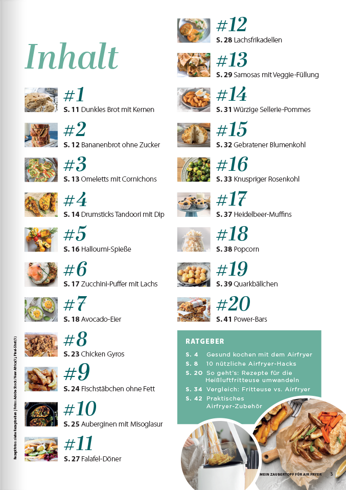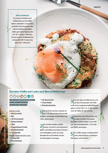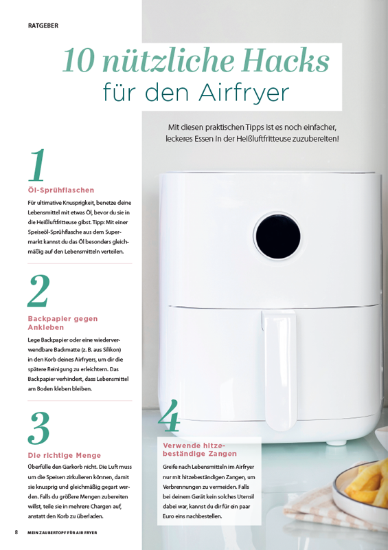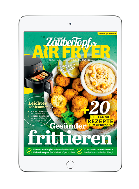 Unser exklusiver ZauberTopf für Air Fryer Einstiegs-Guide für gesundes Kochen zeigt dir, wie du schonend mit der Heißluftfritteuse kochst. Dich erwarten 20 neue Rezepte, außerdem zeigen wir dir, wie du andere Rezepte ganz leicht für den Airfryer umwandelst.