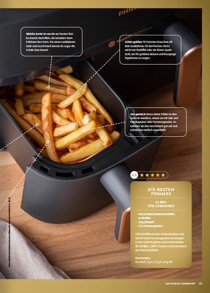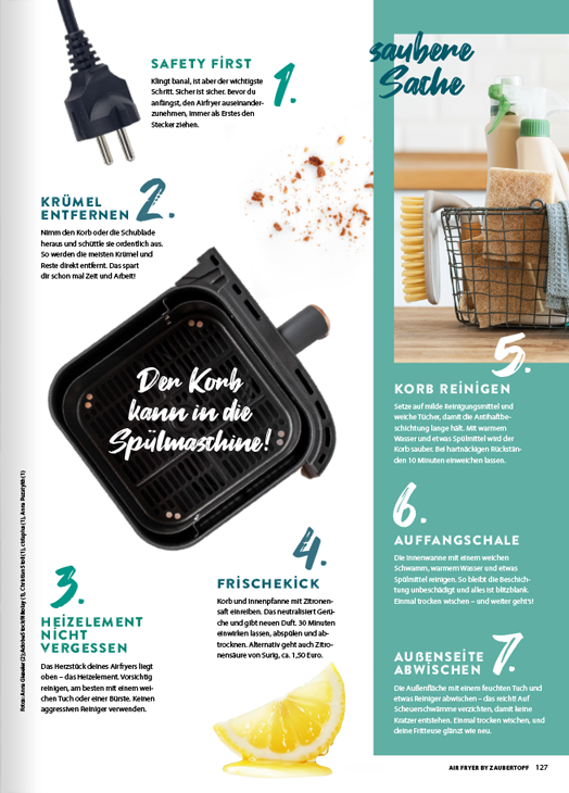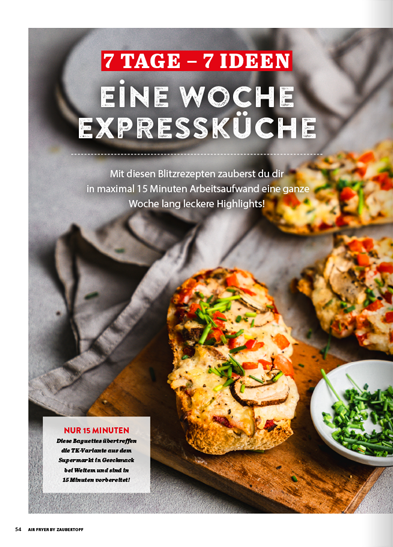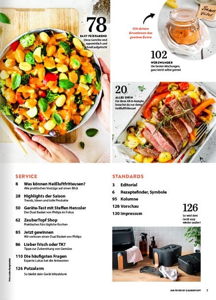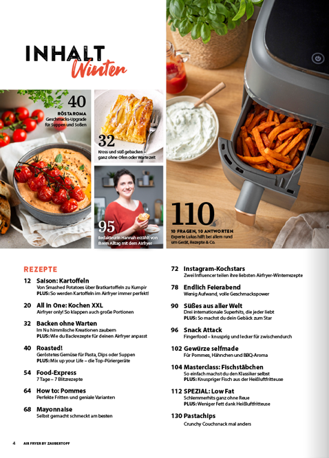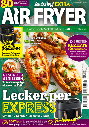Mit der neuen ZauberTopf EXTRA Air Fryer Ausgabe holst du das Maximum aus deinem Trendgerät heraus. Auf 132 prall gefüllten Seiten findest du 80 ultraleckere Rezepte, 100 geniale Hacks und jede Menge Inspiration, um deine Küche zu revolutionieren. Spare Zeit, Geld und Energie – und erlebe, wie vielseitig, gesund und kreativ Kochen mit der Heißluftfritteuse sein kann!